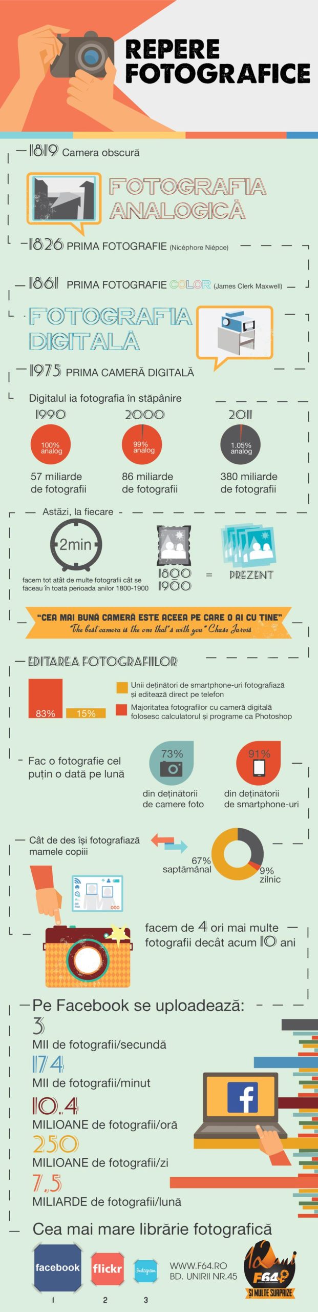 Am decis sa ilustram printr-un infografic cateva repere fotografice esentiale, care sa surprinda viteza cu care s-au produs modificarile foto. De la prima fotografie a lui Nicephore Niepce in 1826 pana la Instagram in zilele noastre lumea fotografiei s-a dat peste cateva ori de cap.